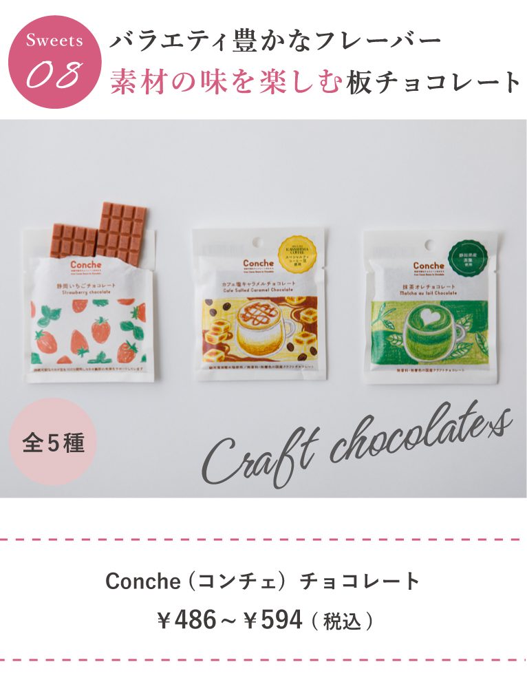 静岡のクラフトチョコレート専門店『Conche(コンチェ)』の板チョコレート。新鮮ないちごの芳醇な香りと甘みが楽しめる「静岡いちごチョコレート」やコーヒーの香りと塩キャラメルのアクセントが調和した「カフェ塩キャラメルチョコレート」など様々なフレーバーがあるのでセットにして食べ比べできるギフトにしても◎
