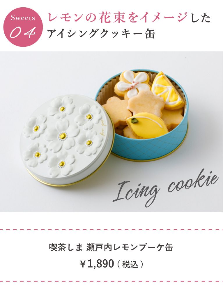 レモンの花束をイメージした缶にレモンをたっぷり加えたクッキーとかわいらしいアイシングクッキーの詰め合わせ。爽やかなレモンの風味は甘すぎるものが苦手な方へのギフトにも!