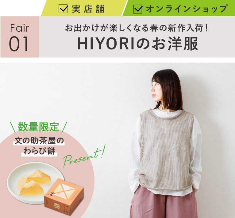4月はHIYORIのお洋服を2点以上ご購入で『文の助茶屋』の「わらび餅」を1点プレゼント!味は「抹茶」「ほうじ茶」「和三盆」の3種類。どれがもらえるかはお楽しみです♪