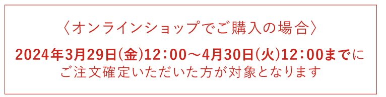 2024年3月29日(金)12:00~4月30日(火)12:00までにご注文確定いただいた方が対象