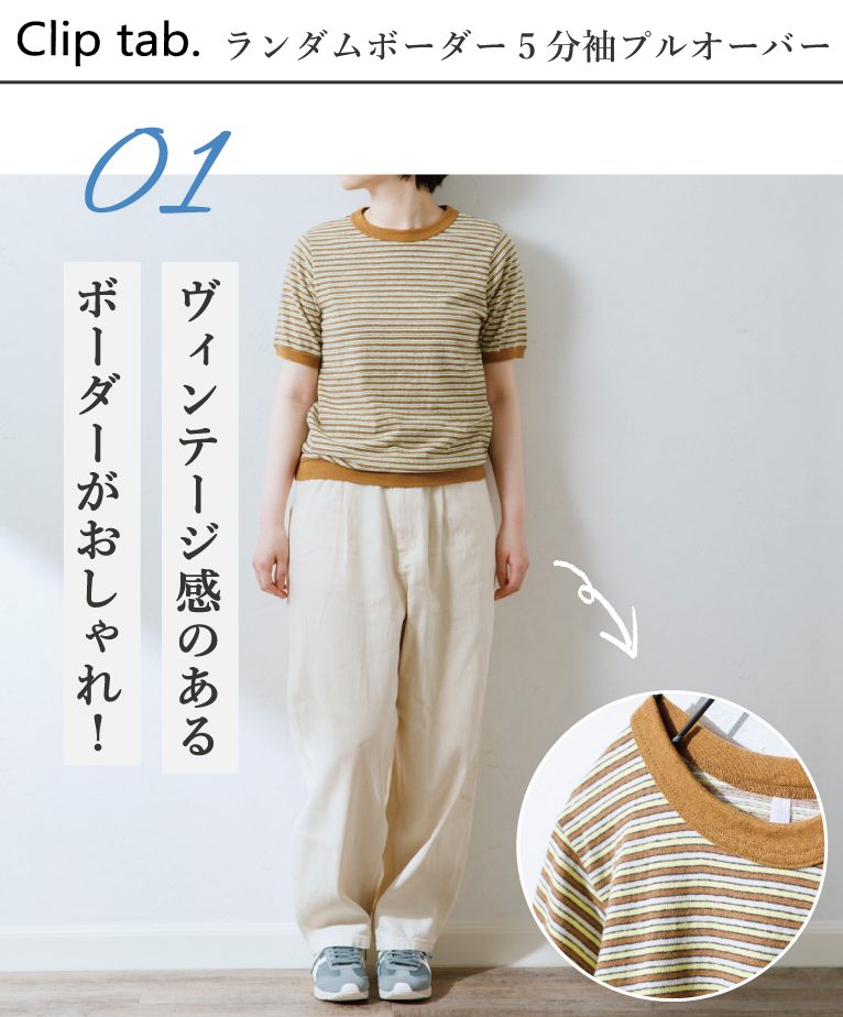 CLIP.TAB(クリップタブ) ランダムボーダー 5分袖プルオーバー ≫¥8,250(税込)
