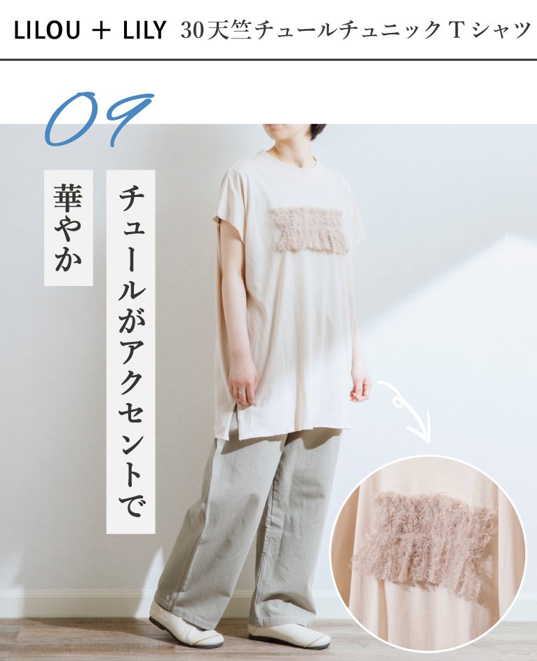 肌なじみの良い30天竺を使用し、程よい肉感と綺麗な見た目がおすすめのTシャツです。合わせ方次第でポップから綺麗めまで幅広いコーディネートを楽しめます。アクセサリーを着けなくてもチュールが華やかでコーディネートの主役になれるTシャツです。
