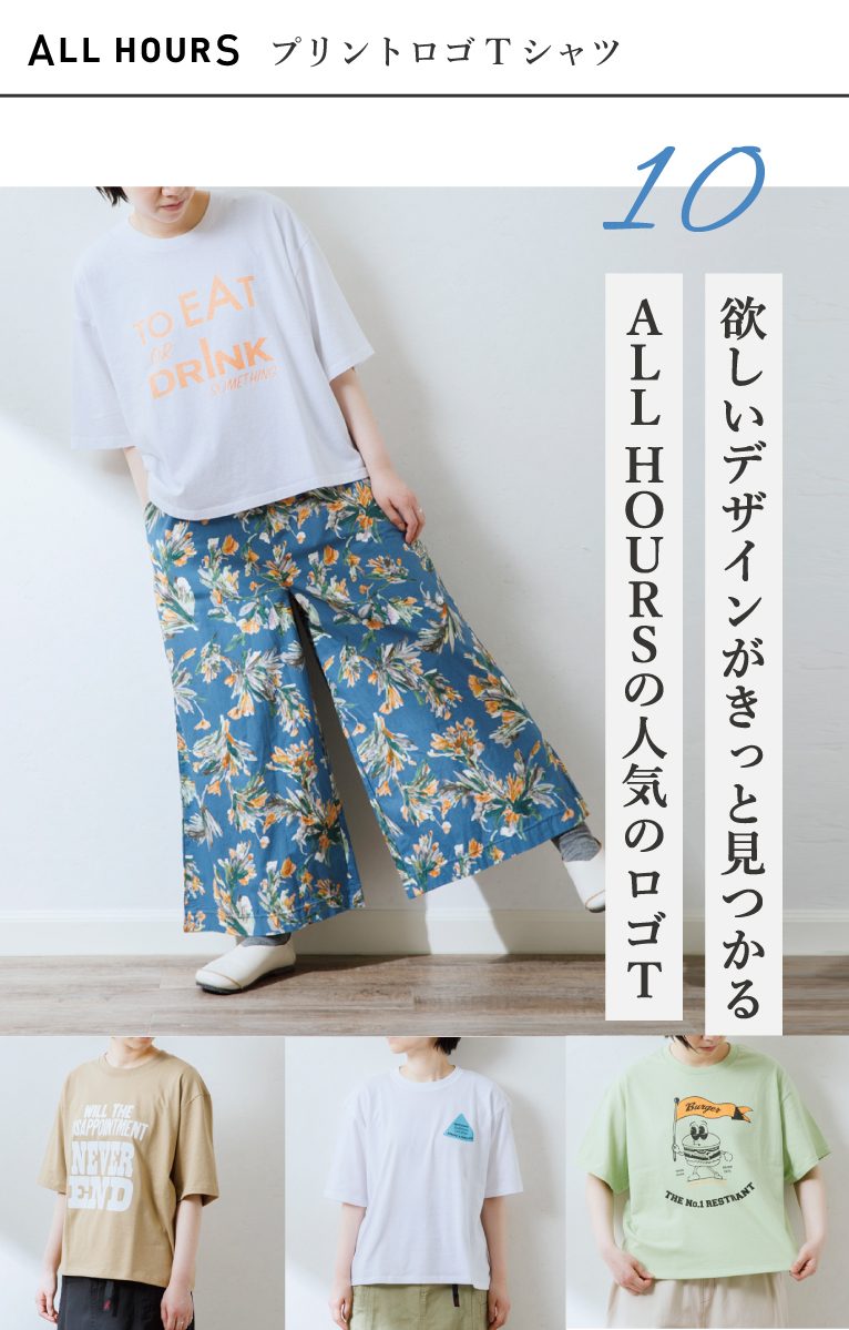 程よい厚みとコットン天竺素材のワイドシルエットが人気の『ALL HOURS(オールアワーズ)』のTシャツはコットン100%、made in japan のこだわりのシリーズです。ゆったりとした身幅、袖幅で気になる二の腕や身体のラインを拾わず、リラックス感のある着心地です。 ゆるい雰囲気のイラストやインパクトのあるロゴが普段のコーディネートに抜け感を作ってくれます。
