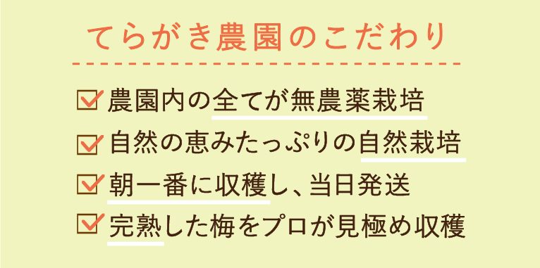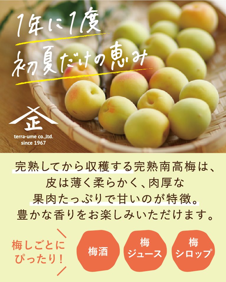 皮ごと食べる梅だからこそ、無農薬・自然栽培にこだわったてらがき農園の「完熟南高梅 生梅」。果肉たっぷりでクエン酸濃度が高まるように樹上にて熟成させています。梅酒や梅ジュース、梅干しづくりにいかがでしょうか。