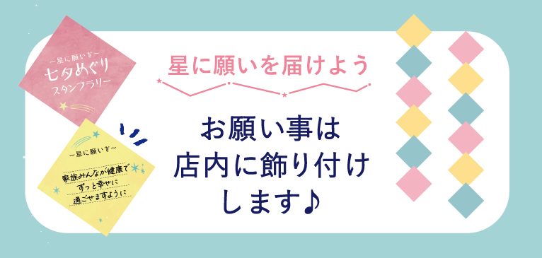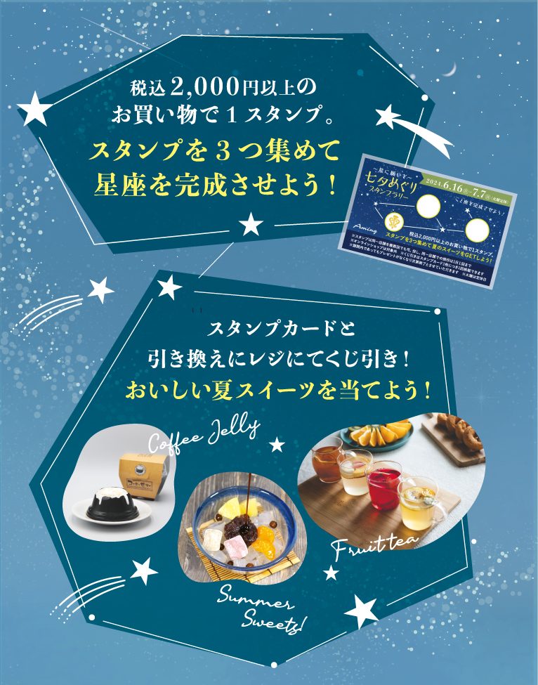 6/16(日)から7/7(日)までの期間中、「~星に願いを~ 七夕めぐり スタンプラリー」を開催♪アミング実店舗にて¥2,000(税込)以上のお買い物でスタンプを1つ捺印。3つ集めて夏の美味しいスイーツをGETしよう♪