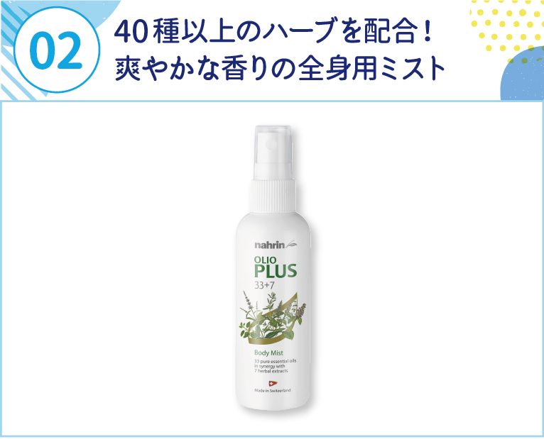 02 40種以上のハーブを配合!爽やかな香りの全身用ミスト♪