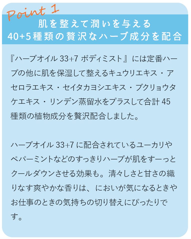 40種類のハーブをブレンドした人気の『ハーブオイル33+7』がボディミストに!リフレッシュタイムを楽しみながら肌を潤す全身用ミストスプレーです。