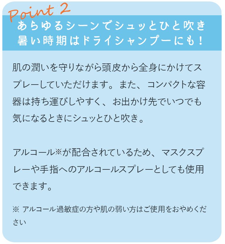 リフレッシュしたいときに、頭皮にシュッとひと吹きしたり外出時にふんわりとボディにまとわせると、そよ風がとても心地良く感じられてお出かけの気分が上がります♪