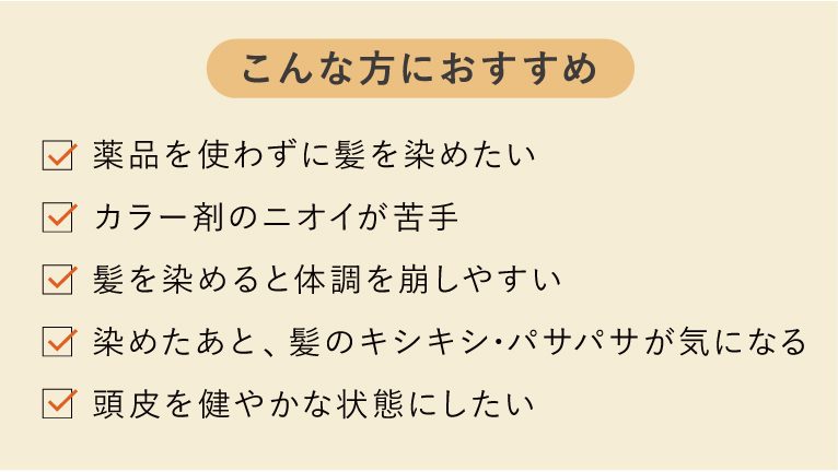 薬品を使わず植物成分のみで染めるヘアカラー「ヘナ」は、農薬や化学肥料を使わず栽培された高品質のヘナを使用。