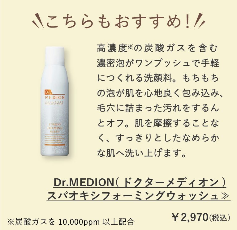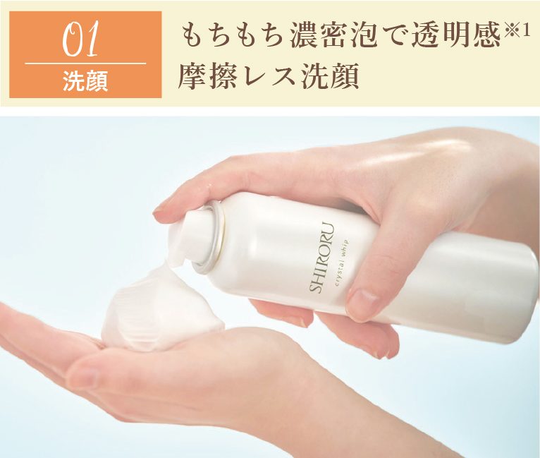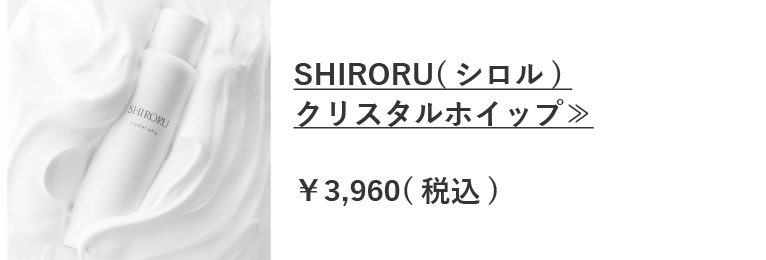 毛穴ケア(※2)におすすめなのは、炭酸洗顔「SHIRORU(シロル)クリスタルホイップ」です。炭酸(※3)の力により毛穴の奥(※2)の汚れや角質などをもちもちの泡で落とします。いつも擦りすぎてカサカサ、ガサガサを感じる方には、まずはこちらをお試しいただきたいです。
