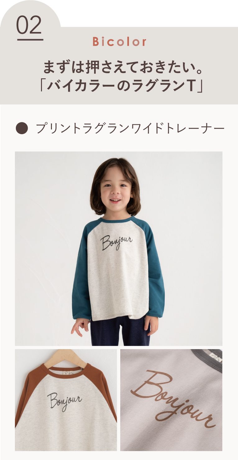 ロゴプリントがおしゃれなバイカラーラグランTシャツ♪ワイドなシルエットが着るだけでこなれ感を演出!ベーシックなカラーリングが大人顔負け!ミニ裏毛で薄手のトレーナーは秋口から活躍すること間違いなし!