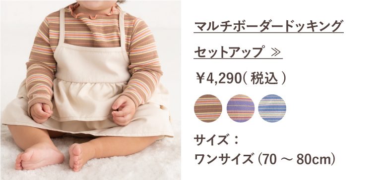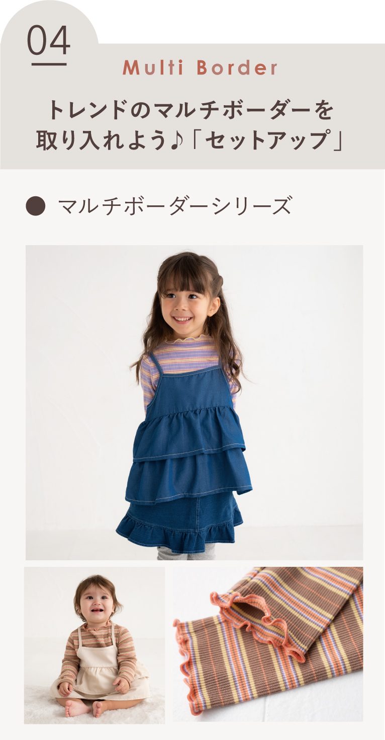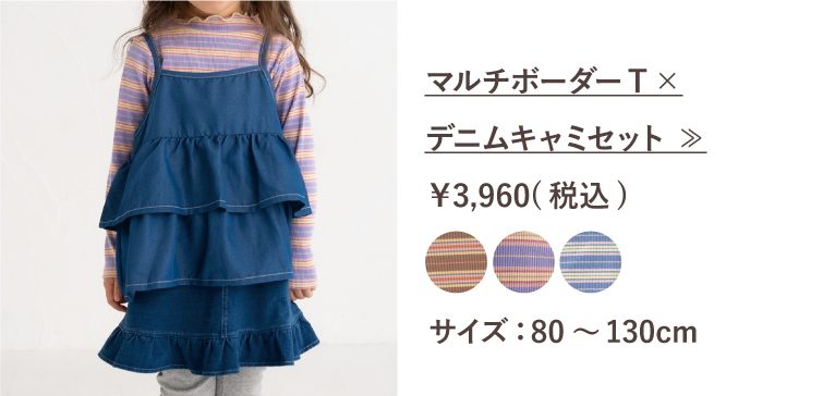マルチボーダーとキャミソールのセットアップとベビーはブルマ付の3点セットです。流行のマルチボーダーとベビーにもうれしい柔らかなデニム風素材はトレンド感も抜群♪