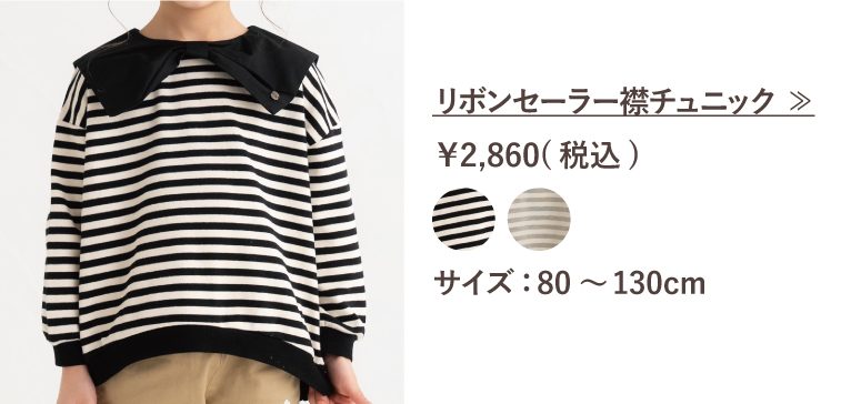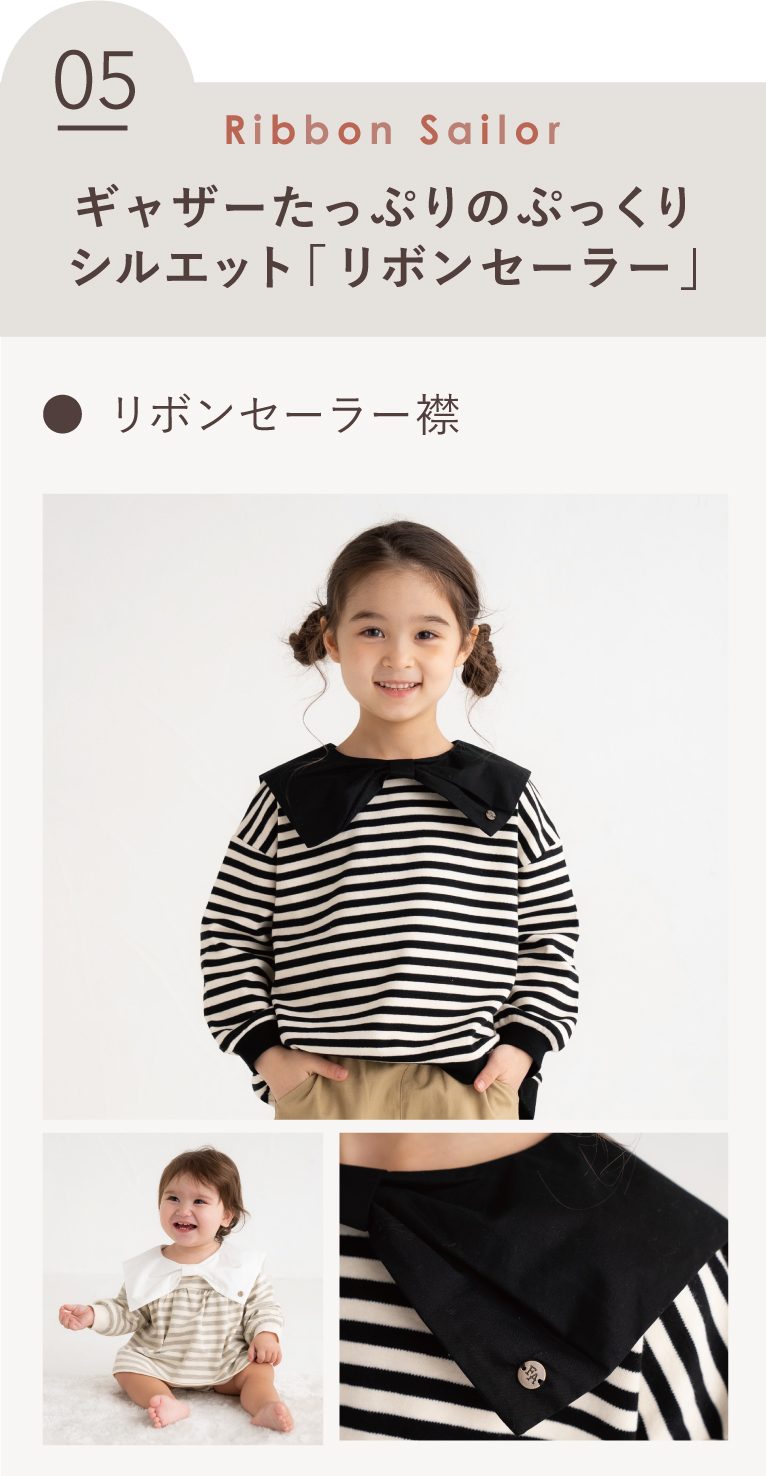 シックなボーダーカラーの中にリボンスタイルのセーラーカラーが華やかな1着♪ギャザーたっぷりのぷっくりシルエットが女の子らしく甘カジュアルなコーディネートをお楽しみいただけます♪伸びの良い素材を採用しているので着心地も◎