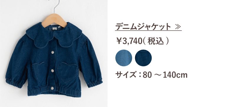 大きめなスカラップの襟とハートのポケットがポイントのかわいいが詰まったデニムジャケットです。少し薄手の柔らかいデニムを使用しているので、秋はもちろん春先も活躍するアイテムです。