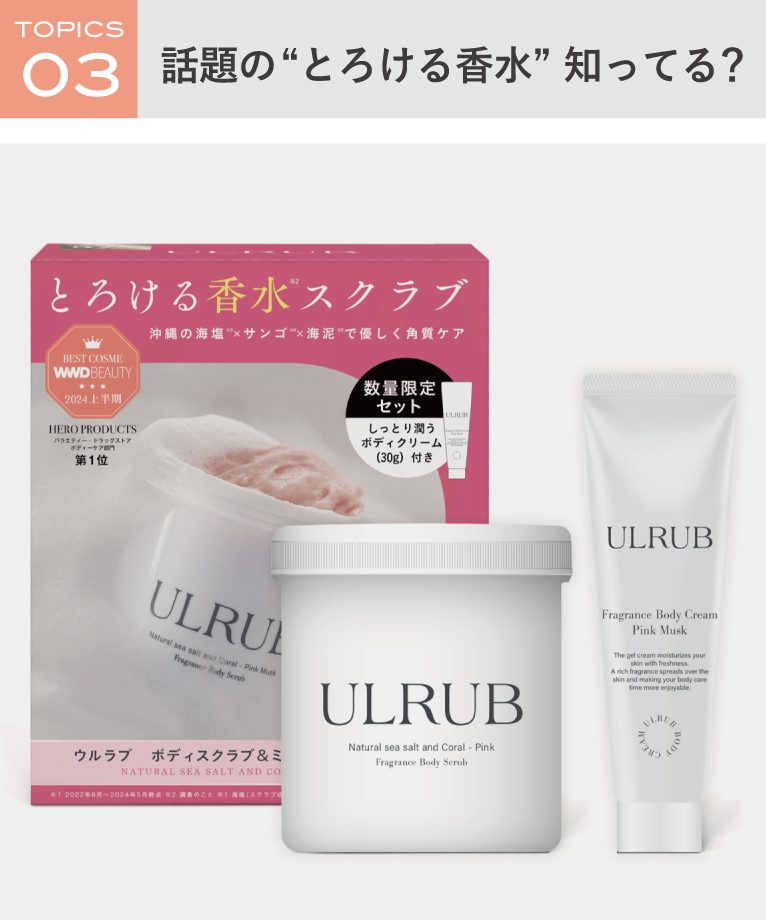 数量限定!「ウルラブボディスクラブ 限定セット」は早い者勝ちッ!?ボディスクラブ&ミニボディクリームセットが登場♪バスルームいっぱいに広がるピンクムスクの香りはまるで香水のよう。