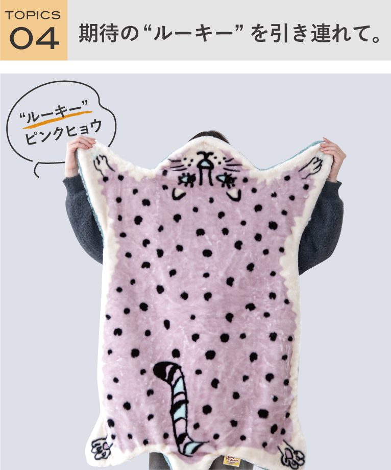 毎年大人気の「モモンガブランケット」。レギュラーのトラが強くてかわいい仲間を従えて今年も登場です!どこか愛着の湧く表情をしたアニマル達は、見た目だけでなく実は手触りも大好評◎
