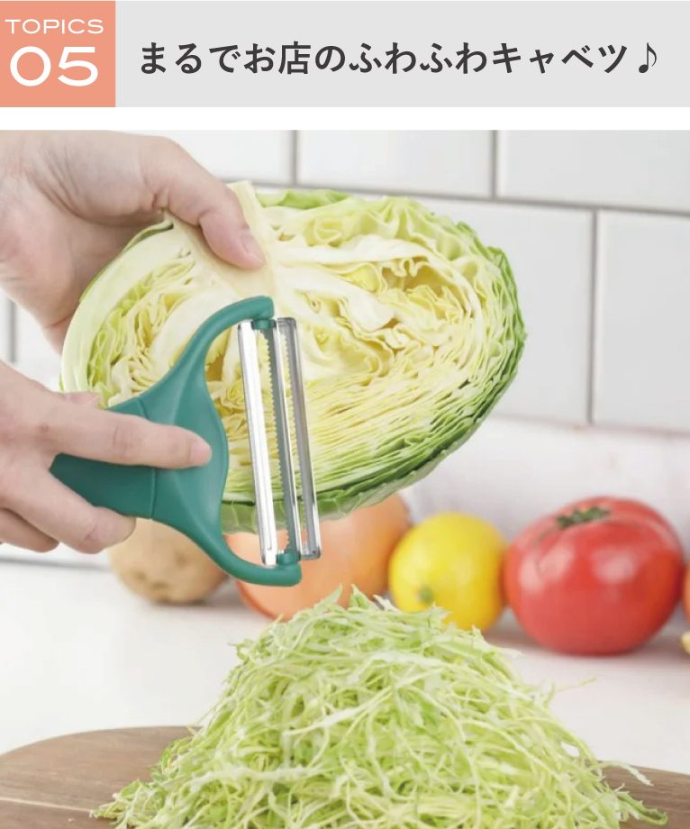 ふわっと食感が命!のキャベツの千切り。なかなか均一な太さに切れなかったりして大変ですよね。そんなときは「ののじ キャベピィMAX」がおすすめ。二枚刃を使用し、軽い引き心地と切れ味にこだわり、キャベツの繊維をサクサクッとスライスします。細かく均一な太さになるので見栄えも良し!お店のような千切りをご自宅で楽しめます♪