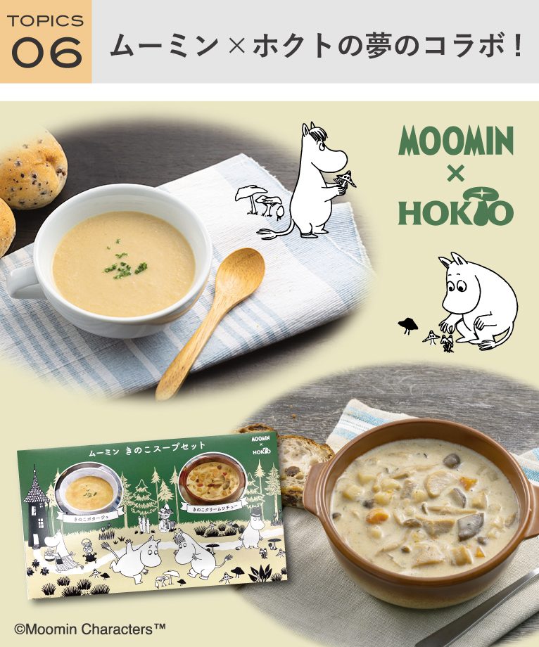 大手きのこメーカー『HOKUTO(ホクト)』と北欧童話のムーミンがコラボしたおうちで本格的な味わいを楽しめる「ムーミンきのこスープセット」。“きのこポタージュ”と“きのこクリームシチュー”でココロもカラダもほっこり!温めるだけですぐに食べられるレトルトスープが2食ずつ入ったセットです♪