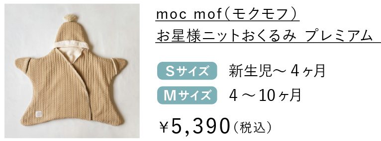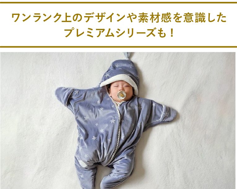 滑らかで手触り抜群の表地に刺繍風の模様が付いた『お星様おくるみ プレミアム』と高級感のあるケーブルニットの素材感がポイントの『お星様ニットおくるみ プレミアム』の2シリーズ。