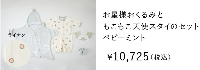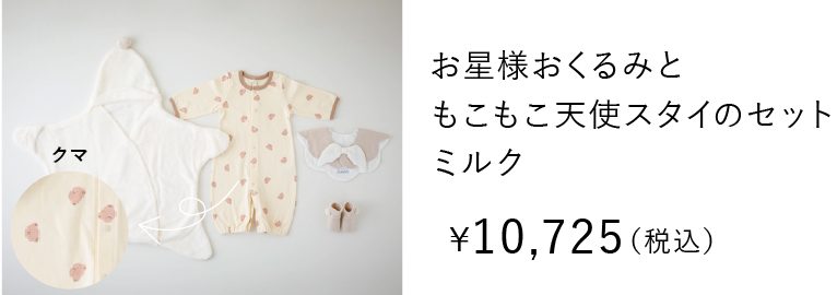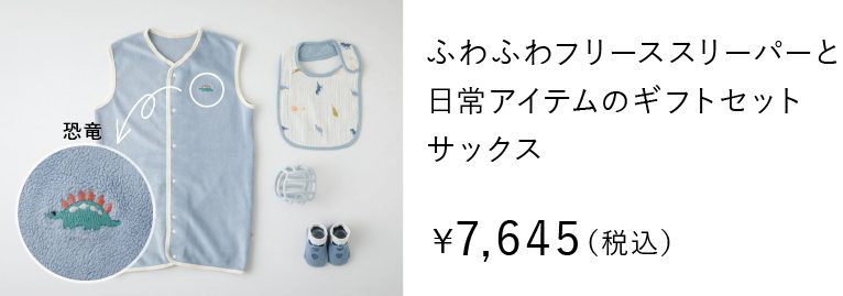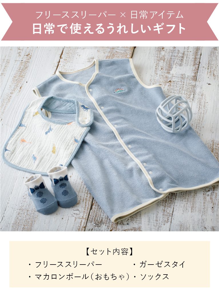 おうちで大活躍のスリーパーに、生まれてすぐの赤ちゃんにうれしい、ふんわり柔らか素材のガーゼスタイや、カラーがお洒落なボールTOYを組み合わせました。