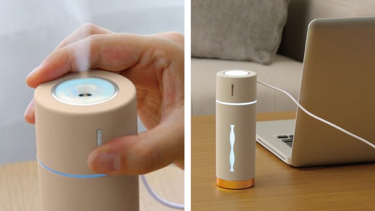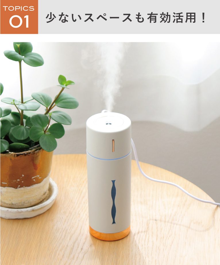 抗菌仕様、水溶性アロマオイル対応の「加湿器MINI HUMIDIFIER ルビンプラス」。手のひらサイズで、机の上でも邪魔にならないコンパクトサイズがうれしいポイント。