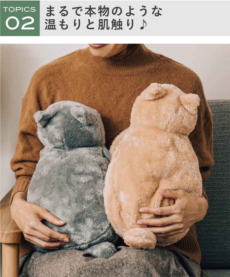 自然な重みと温かさで、抱っこしているだけで心も体も温めてくれる「蓄熱式 アニマル湯たんぽ」。冷えがちな手足は、直接お腹部分に入れてしっかり温めることができます。