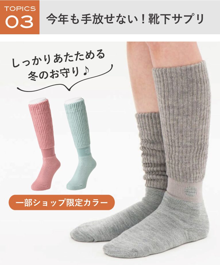 毎年大人気の「靴下サプリ まるでこたつソックス」に一部ショップ限定カラーが登場!つま先からふくらはぎまであったか。レッグ部分は2重編みで、クシュっとさせても、のばして履いても足元をやさしくあたたかく包みます♪