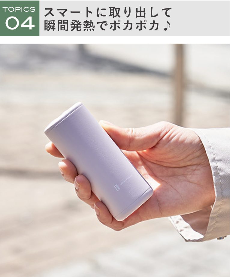 「持ちやすいスリムカイロ」は、握りやすい形で冷えた手指を即ポカポカに。触り心地の良いシンプルなカバーを付属しており、未使用時の本体の冷たさや熱感を防ぎます。
