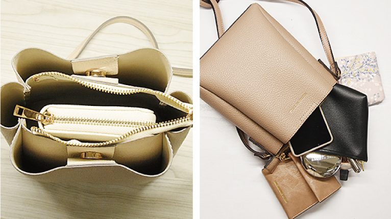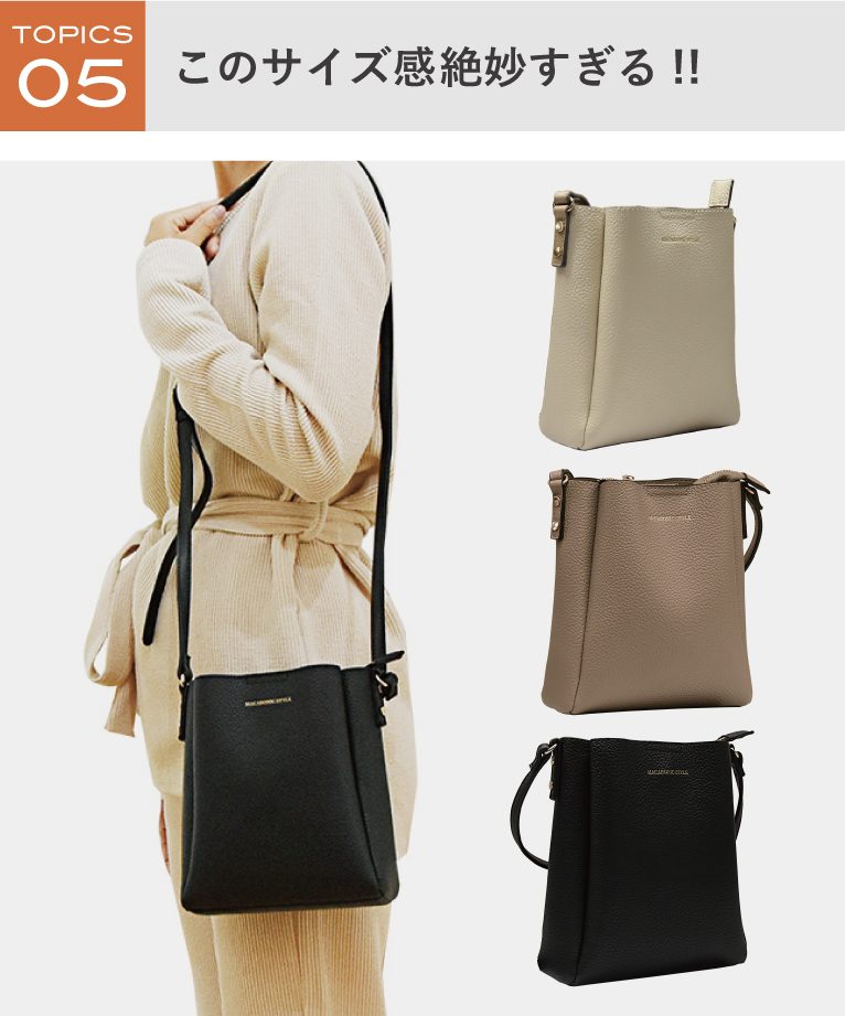 絶妙なサイズ感の3層ショルダーの「2WAYたて型ミニショルダー」。小さく見えてしっかりマチがあるので厚みのある物もラクラク入っちゃう♪