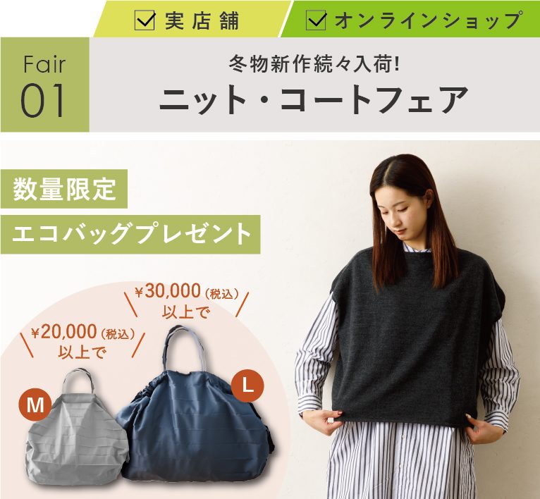 11月はニットまたはコートを1点以上含む大人のお洋服を¥20,000(税込)以上ご購入で「エコバッグ」を1点プレゼント!