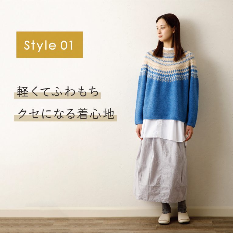 毎年人気のアイテム!アミングオリジナルのノルディック柄ニットプルオーバー。今年は3色のノルディック柄が登場。ストレッチ性のあるクセになるようなふわもちの触り心地です。混合素材なのでおうちで手洗いができ、扱いやすいのも魅力の一つです。見ているだけでも伝わってくるようなふんわり柔らかい素材で毎日着たくなる、リピーターの多いアイテムです!