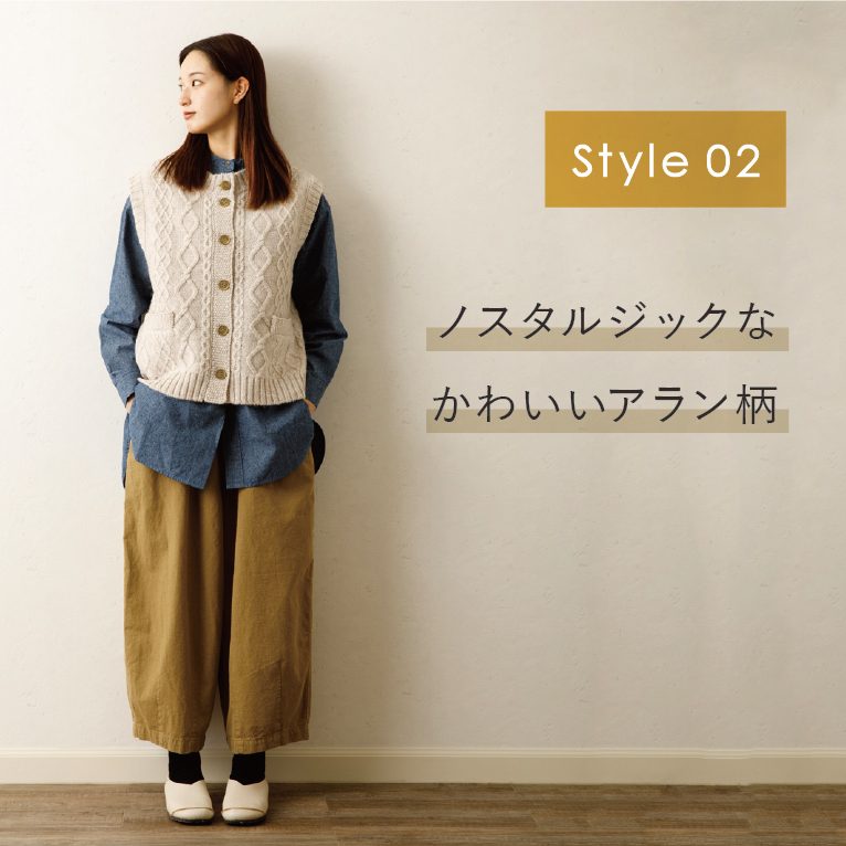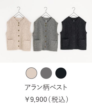 今年のウール100%のベストは、柄をノスタルジックなアラン柄でつくりました。アラン柄部分だけではなく、釦ホール部分や首元、裾の細部のデザインまでニットの編み方にこだわった特別な1枚です。1枚取り入れるだけで冬らしいかわいい着こなしに。コートなど羽織からのぞく表情もかわいいベストです。