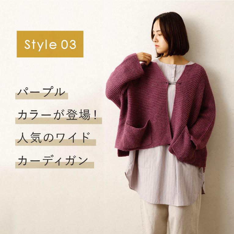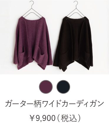 ガーター編みが特徴的なアルパカ混ニットでつくったワイドカーディガン。丈は少し短めでワイドサイズの、ざくっと羽織って落ち感のあるシルエットがかわいいです。こちらは昨年人気ですぐに完売してしまったアイテムを再生産!新色に優しい印象のパープルカラーが登場。セットでニットピンが付いています。