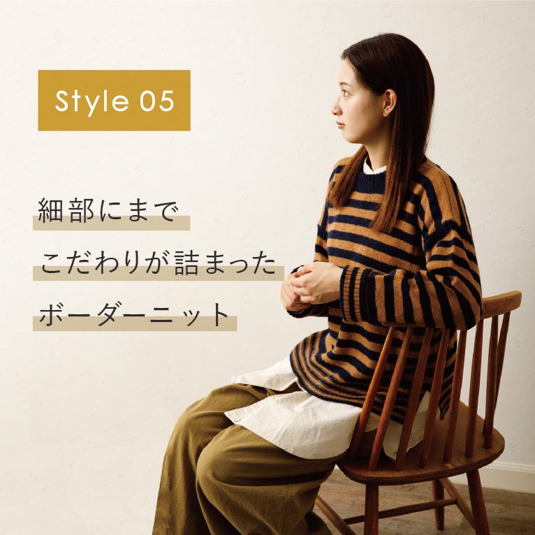 ウール95%にナイロン5%でつくった、軽くて暖かいのに耐久性もある丈夫な素材が特徴のウーレンニットで、ナチュラルな雰囲気に仕上げたのボーダーニットです。裾・袖口のみ、ボーダーを細くして全体が華奢見えするように、また、アームホールと裾をリブ編みやガーター編みにするなど細かいデザインにこだわった1枚です。
