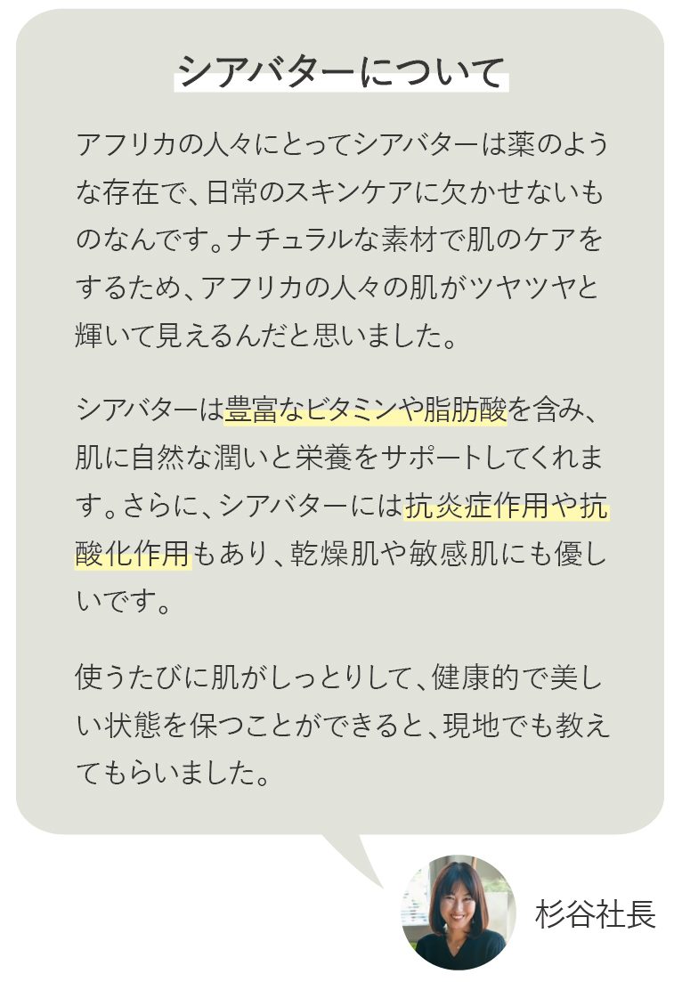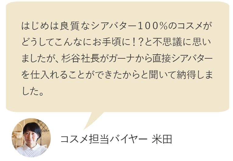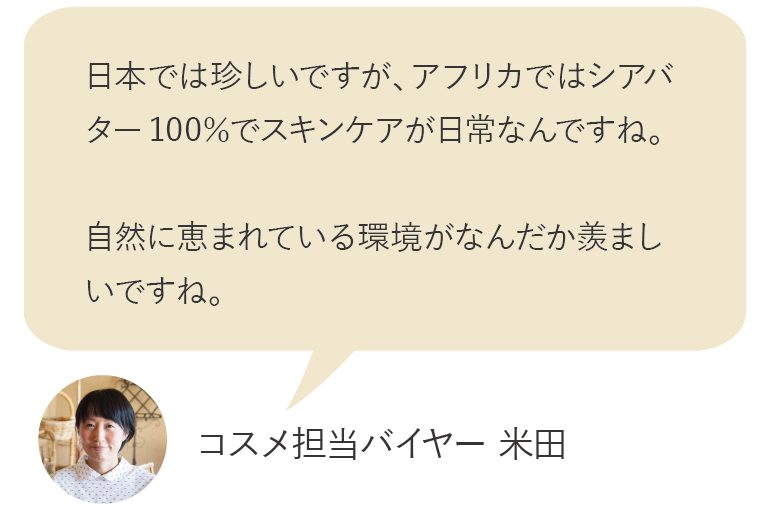 通常のシアバターは配合率3%あればしっかり潤うと言われるところ『フェイス&ボディーバター』は贅沢に100%!『ハンドクリーム』にも20%と高配合されています♪シアバターをこんなにも贅沢配合できるのは「MAMA BUTTER」ならではの魅力です。