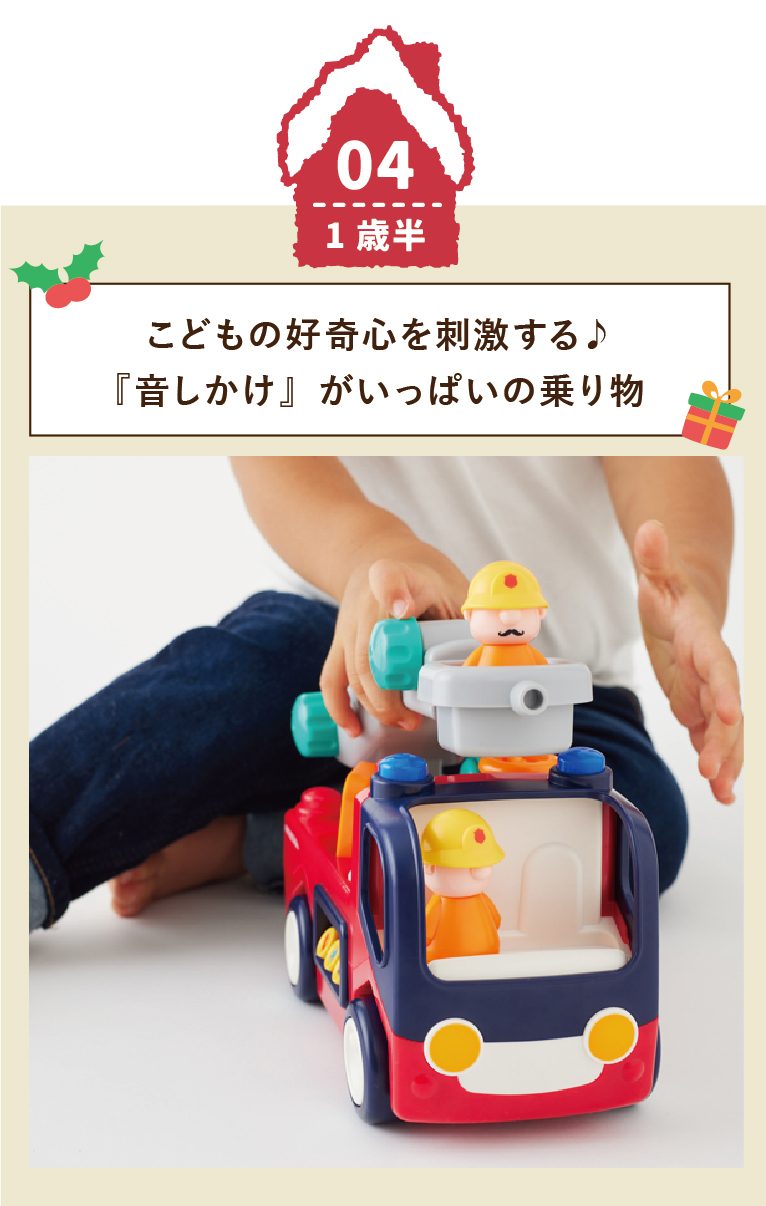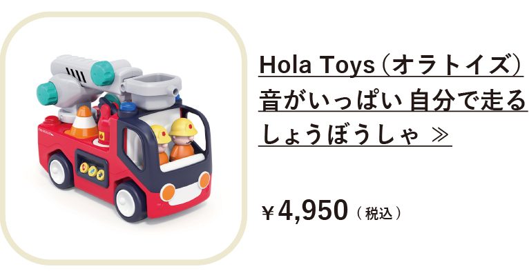 サイレン音や音楽が流れるサウンド機能、自分で走る走行機能がついた『Hola Toys(オラトイズ)』の音がいっぱいおもちゃ。人形や道具を取り外してごっこ遊びも楽しむことができます。