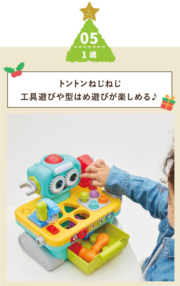 ボールを穴に落とすと音楽が鳴り、目がくるくる!ブロックの型はめをすると英語でカタチの名前を教えてくれるしかけも?!ドライバーでネジ回しやハンマーで釘をトントンしたり楽しくDIYごっこをすることもできてとにかくボリューム満点♪