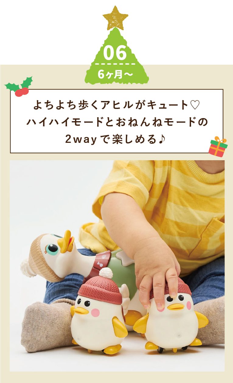 かわいいのに機能性◎のアヒルの親子。赤ちゃんが夢中になるメロディや効果音がたくさん。ハイハイモードでは、アヒルにヒヨコを連結させて色々な歩き方を楽しめるので、つられて赤ちゃんもハイハイの練習にも。おねんねモードではやさしいメロディと星のライトで赤ちゃんのねんねをサポートします。