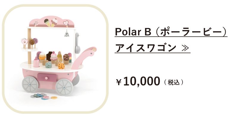 アイスクリーム、ソフトクリーム、アイスキャンディー、キャンディー、ソースボトル、スクープ、コインがついた「アイスワゴン」。アイスクリームとコーンは自由に組み合わせられるので、遊びの幅が広がります。付属のコインで楽しくお店屋さんごっこができて、カラフルな色味とかわいいデザインが乙女心をくすぐるアイテムです。