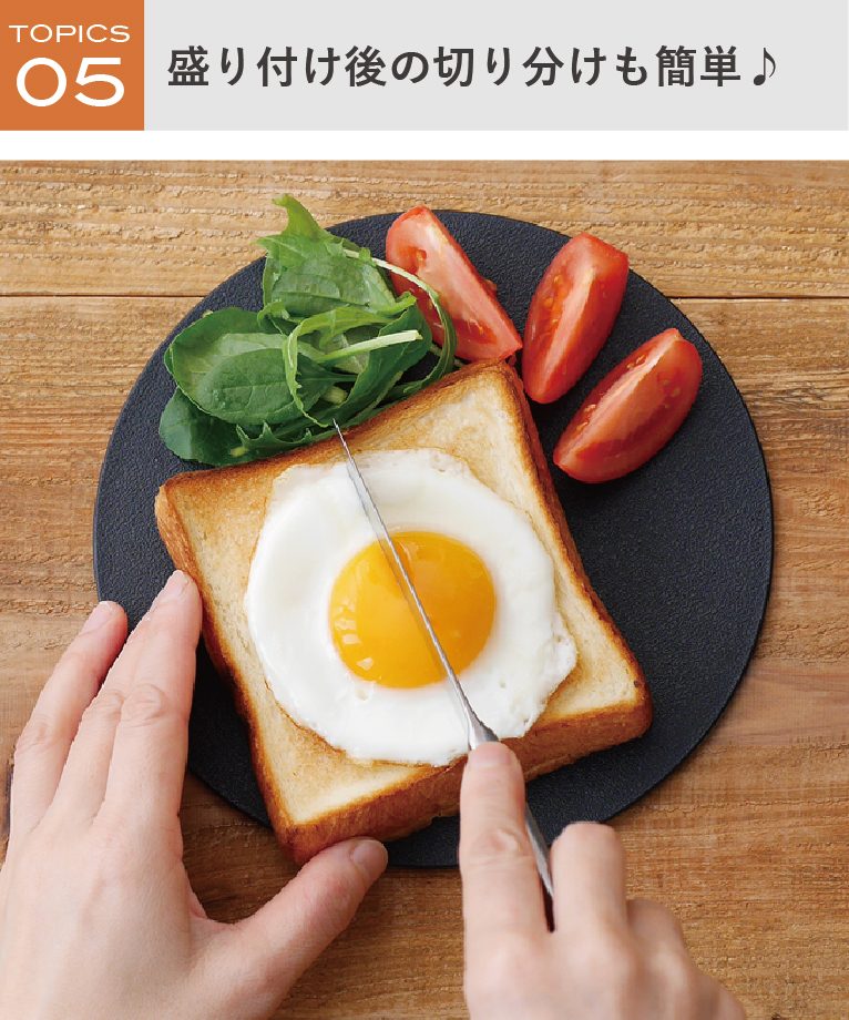 プレートとしても使えるカッティングボード。滑らず切りやすいまな板加工なので、盛り付け後に切り分けたり使い勝手も◎流行りの丸型カッティングボードはSNS映えも間違いなし!