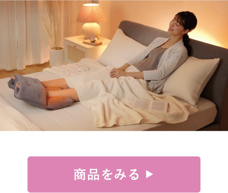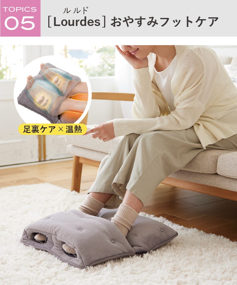 1日立ち仕事をした足に、寝姿勢で使える「Lourdes(ルルド) おやすみフットケア」が登場!足を包み込むように配置したエアバッグが、足への加圧と収縮を繰り返します。土ふまず部の「足裏突起」がグイグイと刺激し、ふくらはぎ部の「温熱」と「振動」で温めながら一定のリズムで振動することで、心地良く睡眠をサポートします。