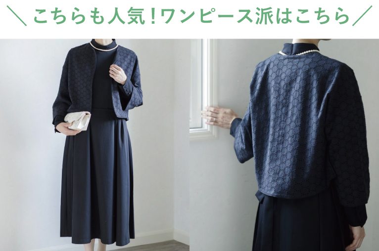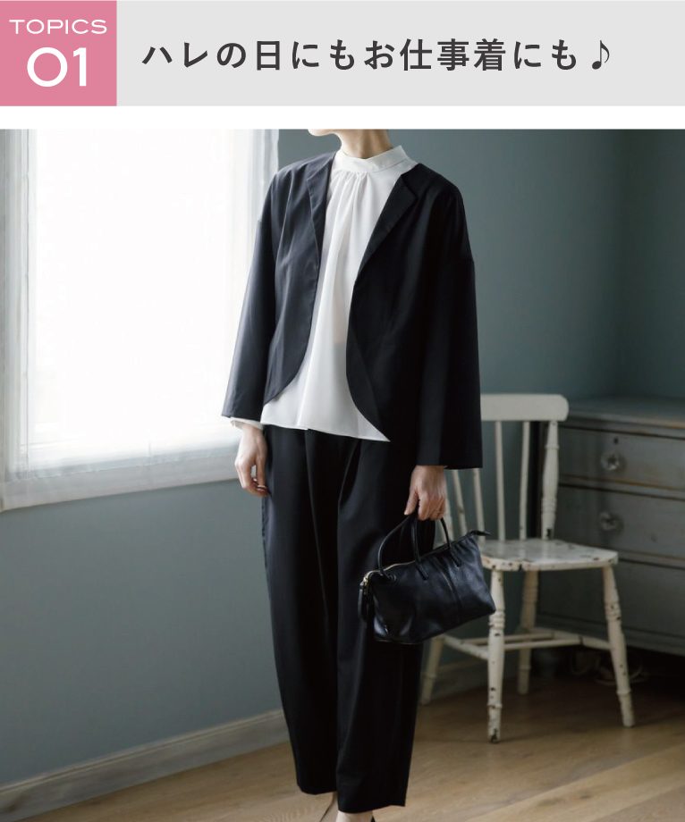 ジャケットを脱いだときにも華やかなブラウスもセットに。きちんとしているのにおしゃれに決まります。美しいシルエットで動きやすく、ハレの日にもお仕事着にも頼れます。