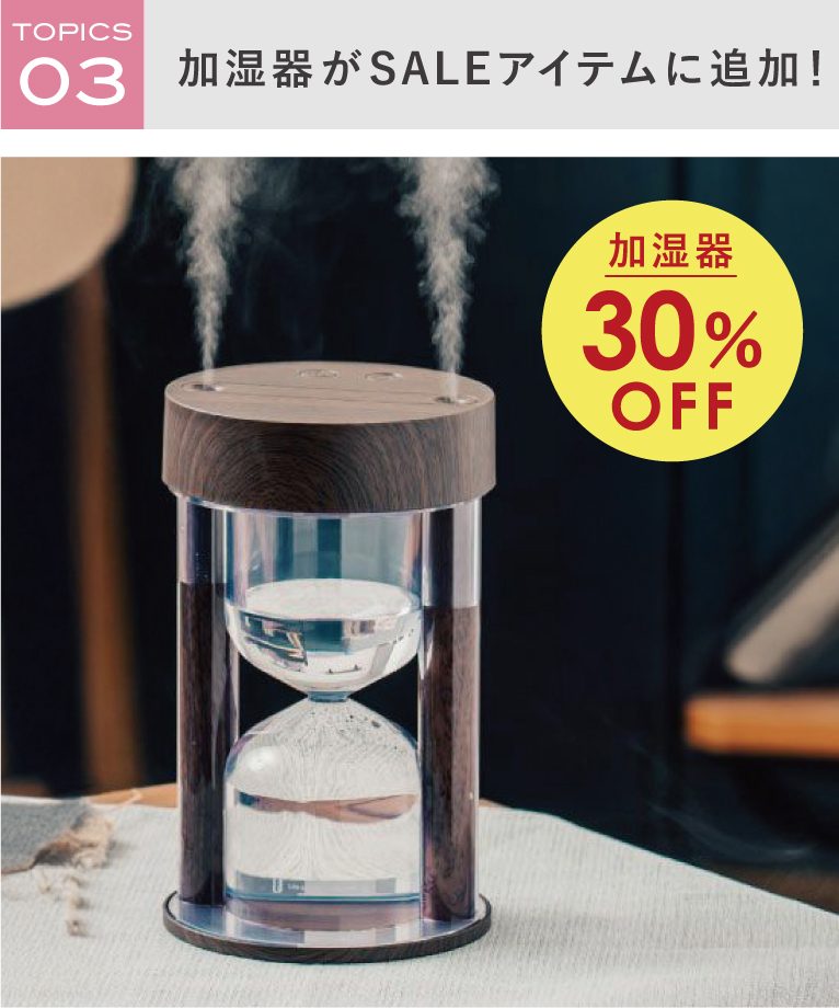 1/17(金)より加湿器各種がウィンターセールのアイテムに追加!インテリア雑貨のような、置くだけで画になるデザインでお部屋をかわいく演出する「Life on Products(ライフオンプロダクツ) 砂時計型コードレス加湿器 ライト機能付」も30%OFFでお得にお買い求めいただけます。