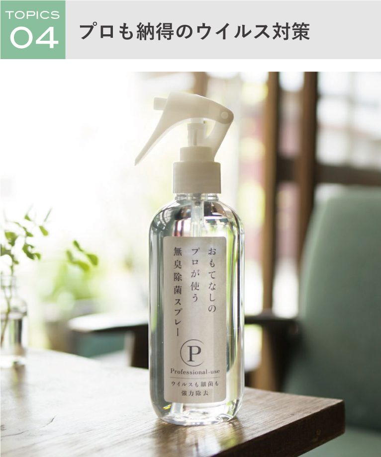プロご用達の除菌スプレー「おもてなしのプロが使う無臭除菌スプレー」は、高い除菌力で世界30カ国以上のスパ・ホテルで採用されているすぐれモノ!大切な人を優しく守りたいと思う気持ちから無臭で低刺激につくられているので、ベビーやペットにも優しいのがうれしいポイント。しっかりと除菌できて、人や環境への刺激が少ない理想的なアイテムです。世界中で選ばれているウイルス対策アイテムを、ぜひご家庭にも。