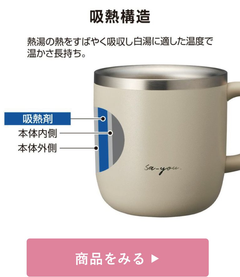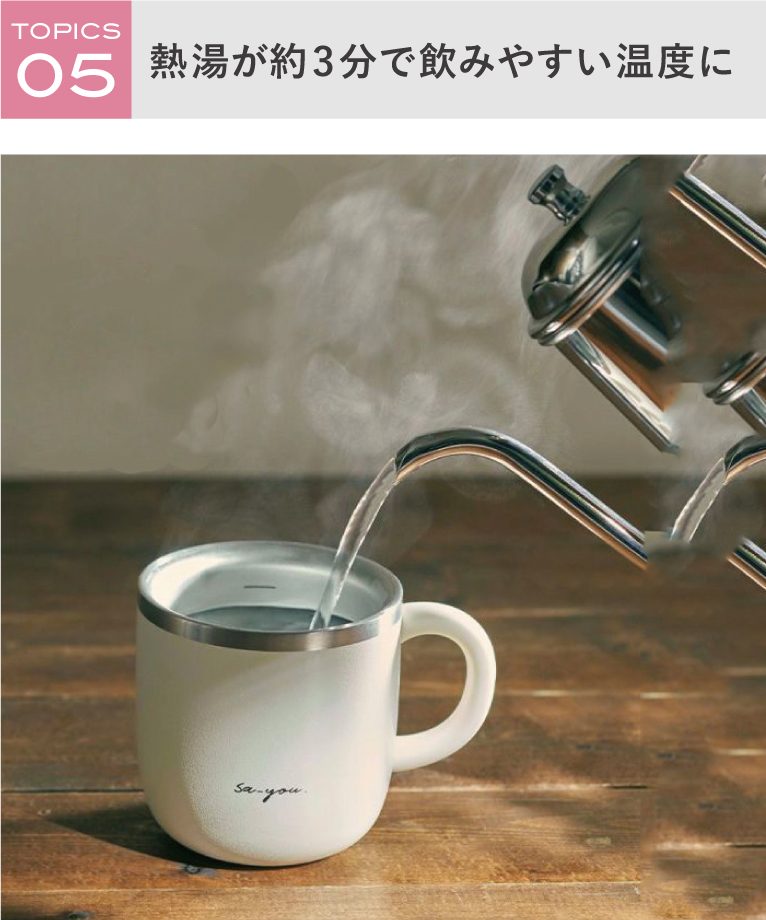 みなさんは朝の白湯、飲んでいますか?朝起きてはじめに白湯を飲むと健康や美容に良いと話題になっています。「オンドゾーン 白湯専科マグカップ」は、熱湯が約3分で飲みやすい白湯になり飲み頃を約1時間キープしてくれるので無理なく温活を始められます。