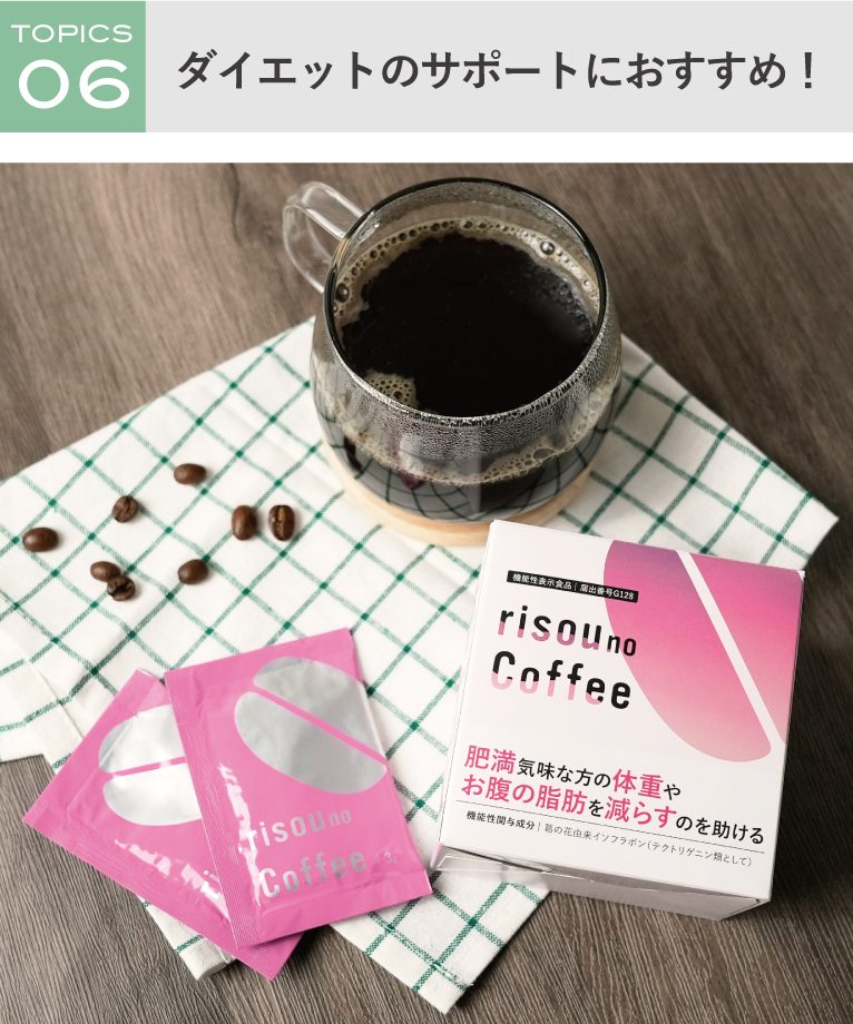 「リソウノコーヒー」は、ダイエットサポートコーヒーとして話題のアイテム。1袋(3g)を100mLの水やお湯に溶かすだけなので、毎日手軽に続けられます。葛の花由来のイソフラボンや炭(チャコール)、MCTオイル、ブラックジンジャー、乳酸菌、植物発酵エキスなどの成分が配合された機能性表示食品のコーヒーです。肥満気味の方やお腹の脂肪が気になる方におすすめです(※1)。