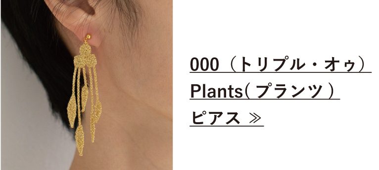 ラメ糸がキラリと光る、繊細な風合いが魅力的な『000(トリプル・オゥ) 』の「マイクロ・スフィア 120(ラメ) ネックレス」と「 Plants(プランツ)ピアス/イヤリング 」。