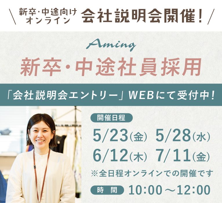アミングでは「手に届く暮らしの幸せ」をコンセプトに、いつ足を運んでも新しいモノやコトとの出会いがあり、心がワクワクする。そんな「素敵」が溢れるお店づくりを一緒にしていく仲間を募集しています。