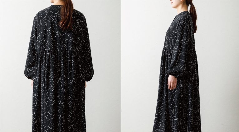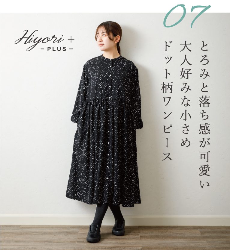 1枚でスタイリングが決まるワンピース。柄物に挑戦したいけれど、派手すぎるのはちょっと…という方におすすめの、大人好みのシックな小さめドット柄です。上品なボリューム感が魅力的。 前開き仕様なので羽織としても◎