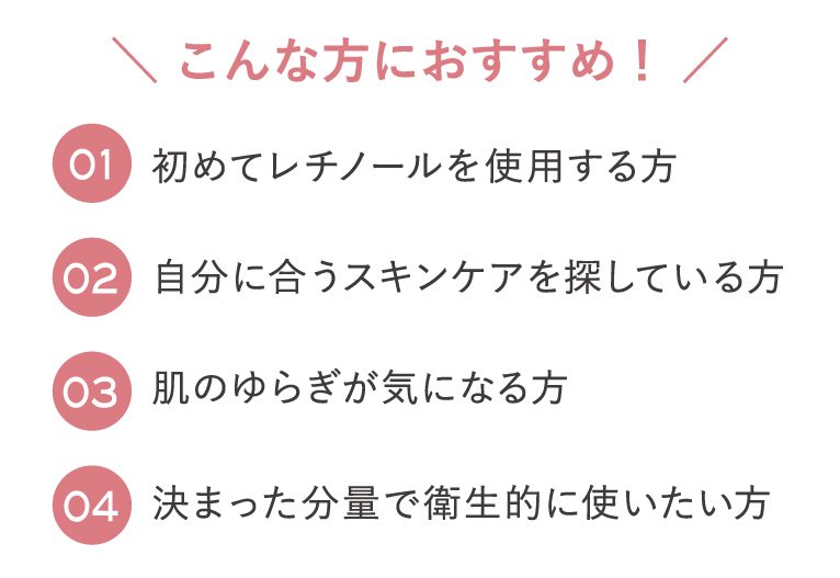 毎日使える、優しい使い心地のレチノール(※2)美容液。毛穴をケア(※3)しながら、弾むようなハリをプラスし、キメを整えます。摩擦の少ないとろみのあるテクスチャーが角質層すみずみまで浸透し、うるおいのある肌に整えます。